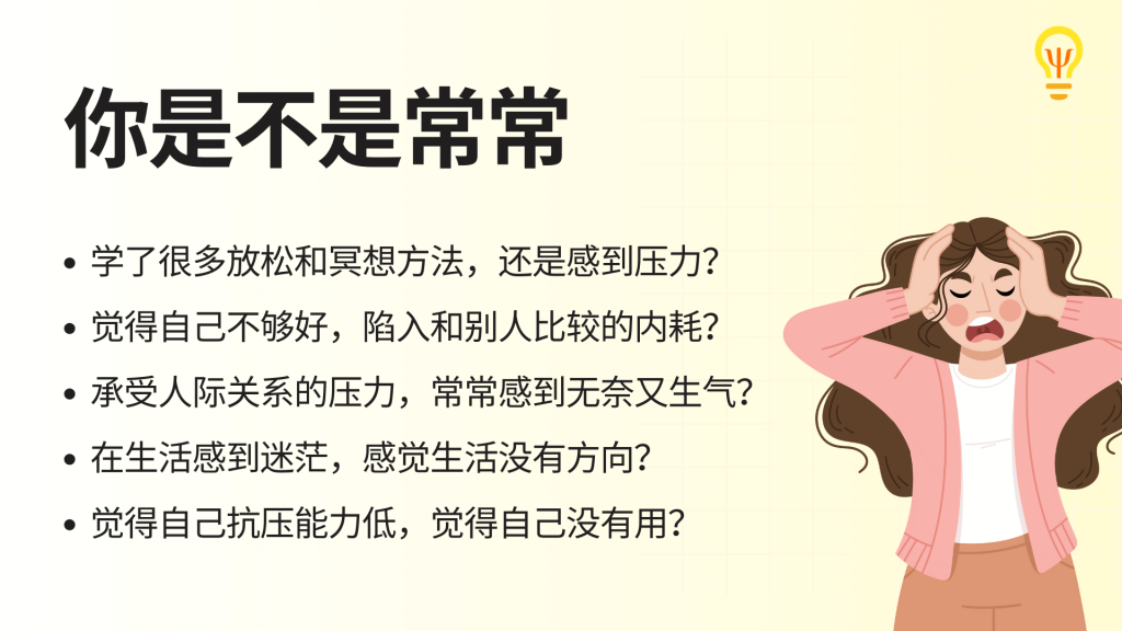 学了很多放松和冥想方法,还是感到压力?觉得自己不够好,陷入和别人比较的内耗?承受人际关系的压力,常常感到无奈又生气?在生活感到迷茫,感觉生活没有方向?觉得自己抗压能力低,觉得自己没有用?