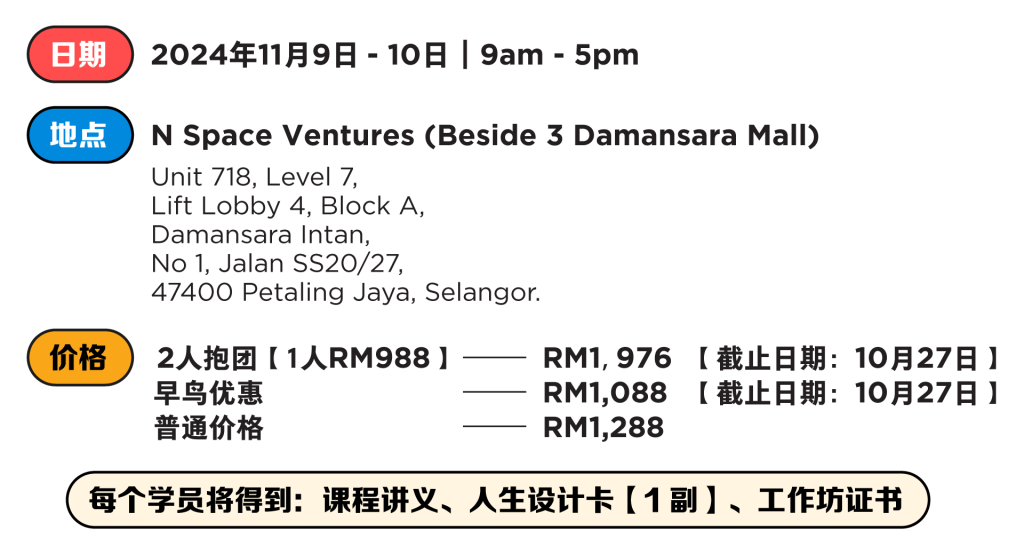 现在还有早鸟优惠哦,每个成功报名的学员即将获得价值 RM110人生设计卡【一副】,